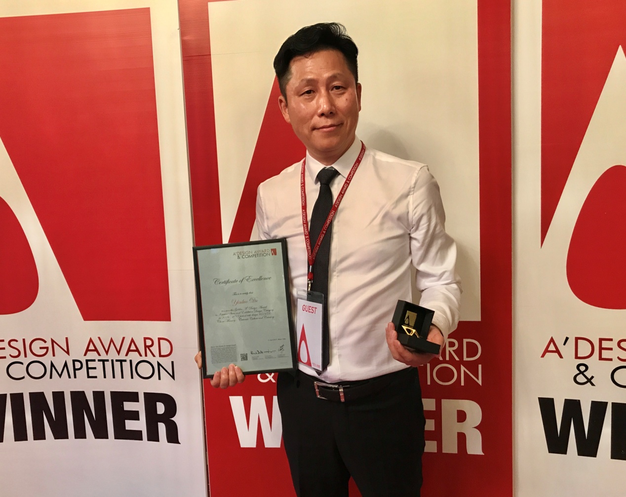 上海瓷憶文化餐廳設計獲得金獎,中航裝飾設計院院長易強作為設計團隊主創設計師與楊超設計師、瓷憶品牌創始人杜銀羅先生一道應邀參加了頒獎典禮。