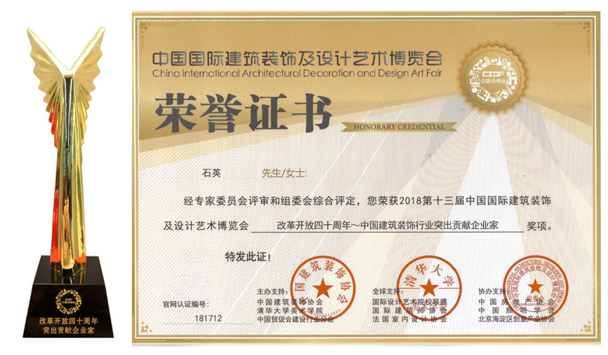 ? ? ??近日,由中國建筑裝飾協會與清華大學美術學院聯合主辦的第十三屆中國國際建筑裝飾及設計藝術博覽會在北京國際會議中心舉行,在本次博覽會上,中航裝飾被授予“改革開放四十周年~中國建筑裝飾行業突出貢獻企業”稱號,中航裝飾集團石英董事長被評為“改革開放四十周年~中國建筑裝飾行業突出貢獻企業家”。
