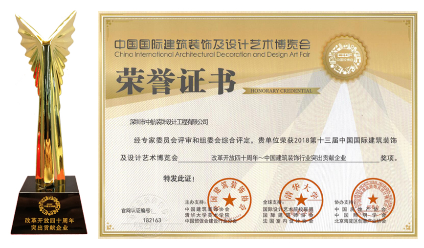 喜訊|中航裝飾集團榮獲“改革開放四十周年~中國建筑裝飾行業突出貢獻企業”