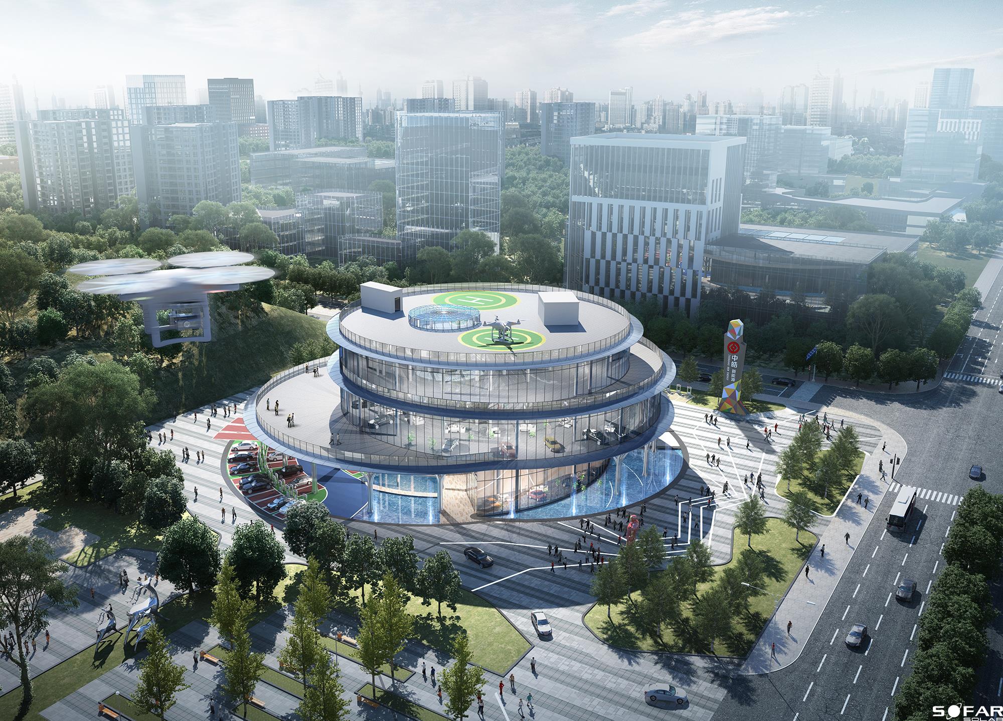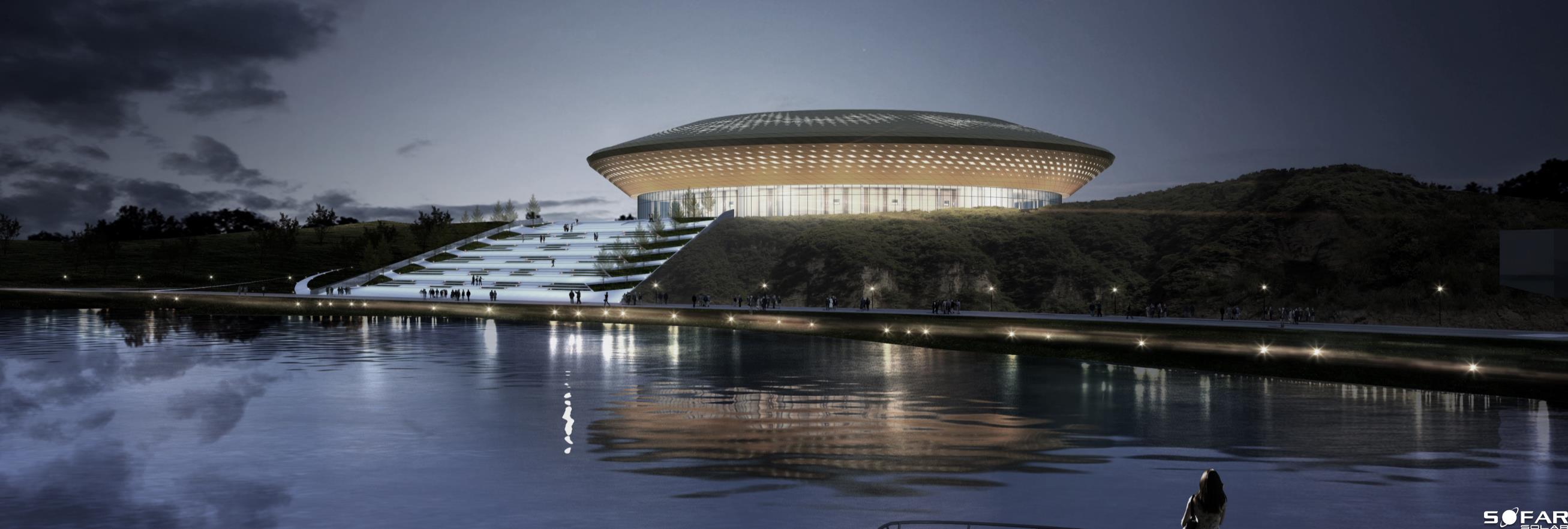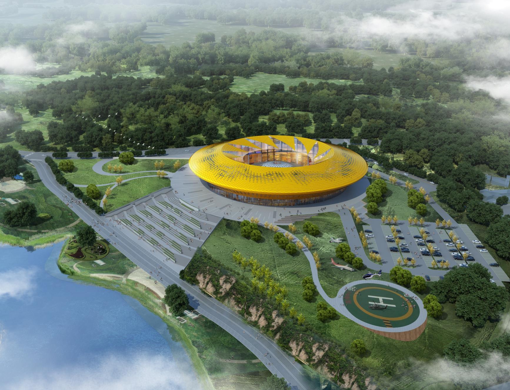 淮州新城國際會展中心采用圓形作為基本形體,通過透明玻璃幕墻從底部托起,營造出建筑整體懸浮半空的姿態,形似“UFO”飛行器。主要分為展覽中心、會議中心、航空博物館和設備用房及庫房等輔助功能區三部分功能分區。一層為展廳,服務于未來航空產業產品的展覽,二三層為會議功能區,服務于大型航空產業會議的召開,四層為航天博物館。未來,淮州新城國際會展中心將成為淮州新城通用航空產業對外展示的窗口。