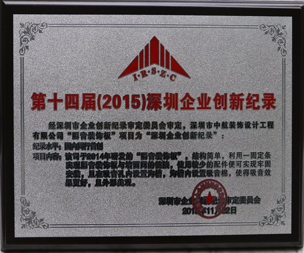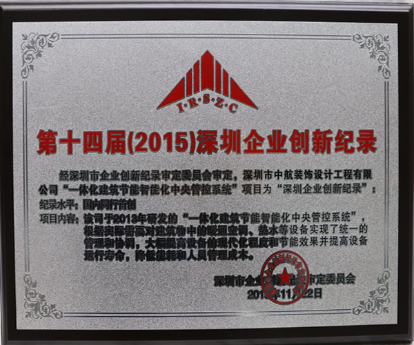 ? ? 2016年1月8日,第十四屆深圳企業創新記錄成果發布會在五洲賓館舉行。大會共審定“深圳企業創新記錄”147項,其中由我公司自主研發的“隔音裝飾板”項目和“一體化建筑節能智能化中央管控系統”項目紛紛獲獎。