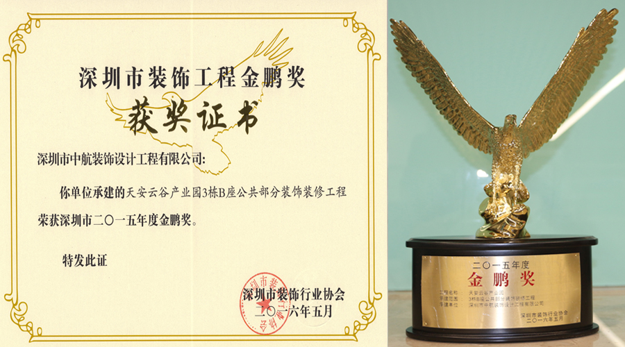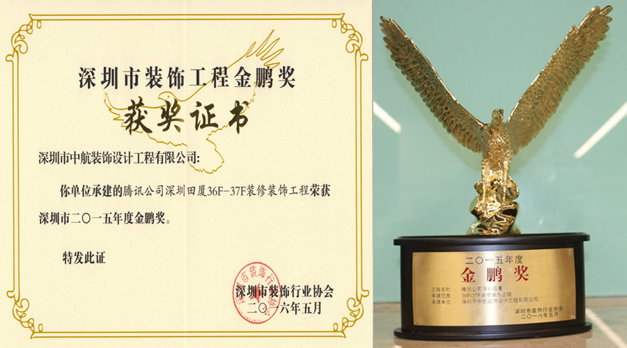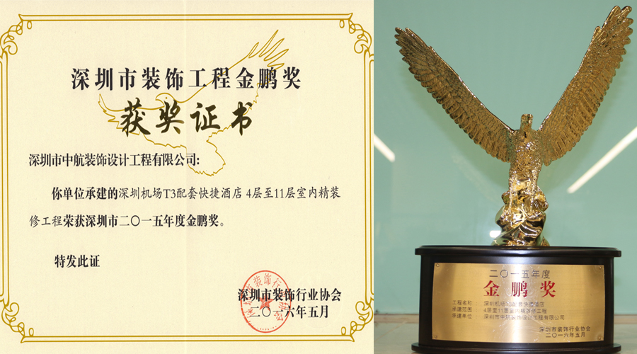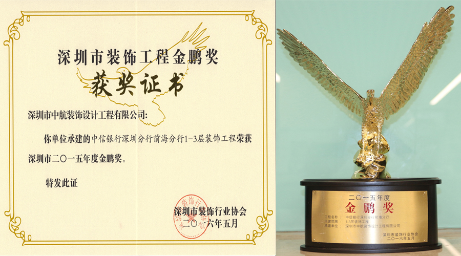 ? ??多年來,中航裝飾集團不斷強化專業(yè)技術工藝,工程質(zhì)量和工程品質(zhì)穩(wěn)步提升。中航裝飾注重品牌建設,更注重品質(zhì)建設,我們堅信只有提升品質(zhì),才能增創(chuàng)效益。深圳市裝飾工程金鵬獎是深圳裝飾工程領域的權威評選,這份榮譽的獲得是業(yè)界專家對我公司裝飾裝修工程優(yōu)秀品質(zhì)的充分認可。我們珍惜這份榮譽的獲得,更希望將這份榮譽載入中航裝飾的史冊,使之延續(xù)并發(fā)揚光大!
